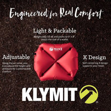 The Klymit Pillow X is supportive and comfortable at a weight you won’t even notice. The Klymit Pillow X is a backcountry sleep necessity and may be the most technically advanced pillow ever developed. The advanced, self-centering X design positions and cradles your head for supportive, stable comfort.