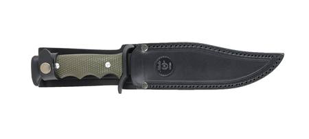 The Miguel Nieto Combat is a practical knife with a fixed blade. A great knife for the forest, for camping, hiking, for outdoor enthusiasts, bushcraft, survival. The shape of the bowie blade makes this knife a great helper for any job. The knife blade is 18 cm long and 4 mm thick. It is forged from AN58 corrosion-resistant steel. This steel has great edge retention properties and is easy to maintain. There is a serrated part on the back of the blade (upper part). The handle is made of ABS plastic, in a green design and is shaped to fit in the hand. The guard and the foot (end) of the handle are made of zamak material. The knife includes a black leather sheath with the Miguel Nieto logo.