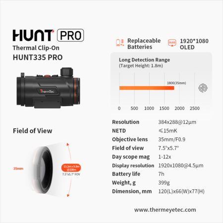 ThermTec Hunt 335 Pro redefines affordability without compromising core performance. Its 384×288 sensor with NETD =15mK delivers reliable thermal clarity for detection up to 1800m via a 35mm lens. The 0.39-inch AMOLED display (1920×[email protected]µm) provides smooth, detailed visuals. Budget-friendly yet robust, it includes 7-hour battery life, replaceable and rechargeable batteries effortless switch. Perfect for hunters seeking a cost-effective thermal upgrade.
